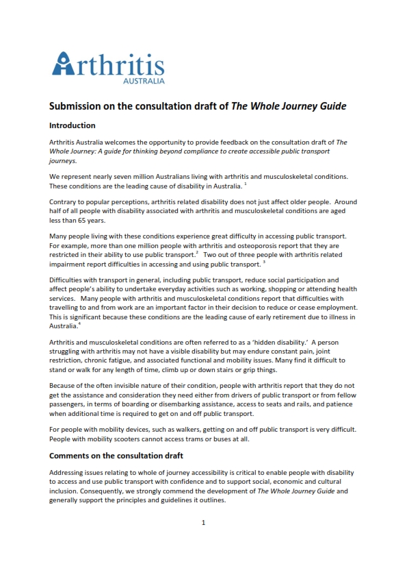 Arthritis Australia made a submission to the government consultation on a draft guide to improving whole-of-journey accessibility for public transport. The key points raised in the submission include: