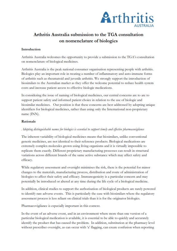 Arthritis Australia made a submission to the Therapeutic Goods Administration’s consultation on naming conventions for biological medicines in Australia.