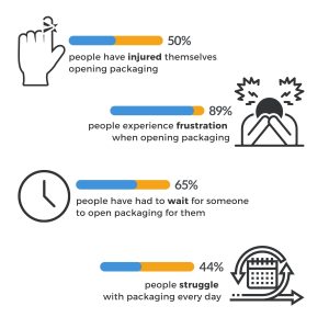 Packaging is also having an adverse impact on quality of life, with 65% of consumers having to wait for someone to come and open packaging for them (Catalyst Research, 2013) and 89% of consumers are currently feeling frustrated or furious with packaging (Catalyst Research, 2013). 53% of consumers have also suffered an injury while trying to open packaging (Catalyst Research, 2013). These negative experiences with packaging can impact a consumer’s life, particularly if they live alone or have a functional limitation. The packaging industry needs to take responsibility for a consumer’s post-purchase experience and consumers should seek alternative products that better meets their needs.